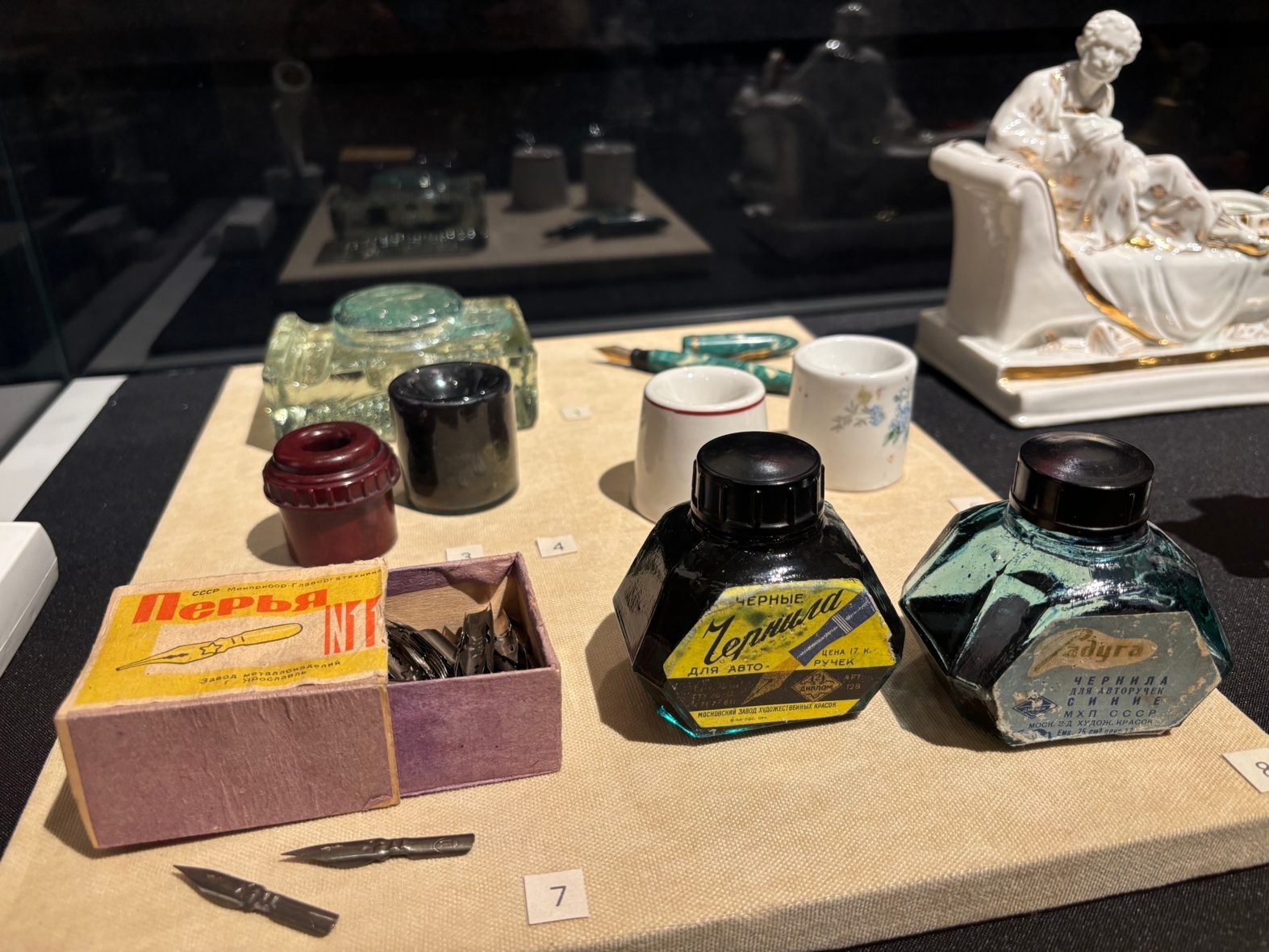 Чернилами писали в нашей стране вплоть до 1970-х гг. В советский период выпускалось множество настольных письменных наборов с перьевыми ручками: школьные, деловые и сувенирные, в том числе посвященные памятным и юбилейным датам.