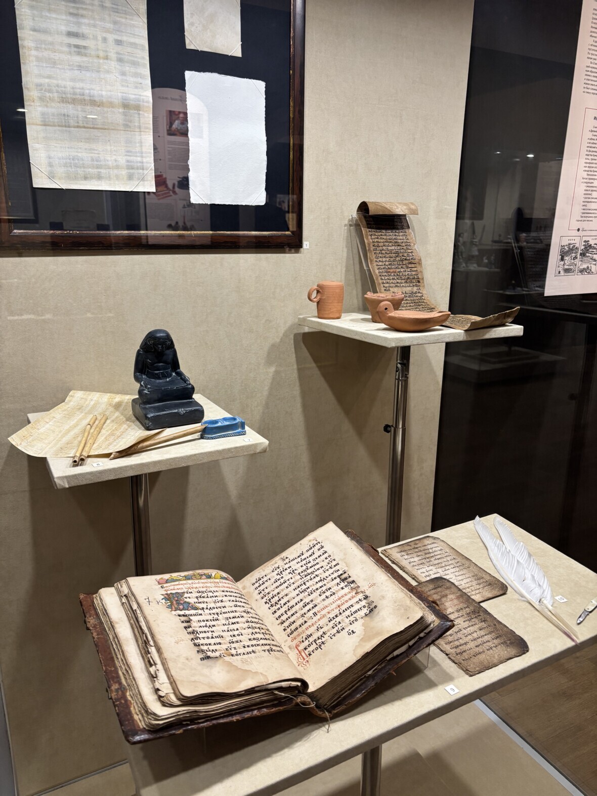 История чернильных принадлежностей насчитывает несколько тысячелетий. Самые древние из них демонстрируются в первом разделе выставки. Основным материалом для письма долгое время был папирус, на котором писали с помощью тростниковых перьев. Позднее его заменил пергамент, а на смену тростниковым перьям пришли гусиные, которыми пользовались вплоть до XIX века. С XI века для письма уже массово используется бумага.