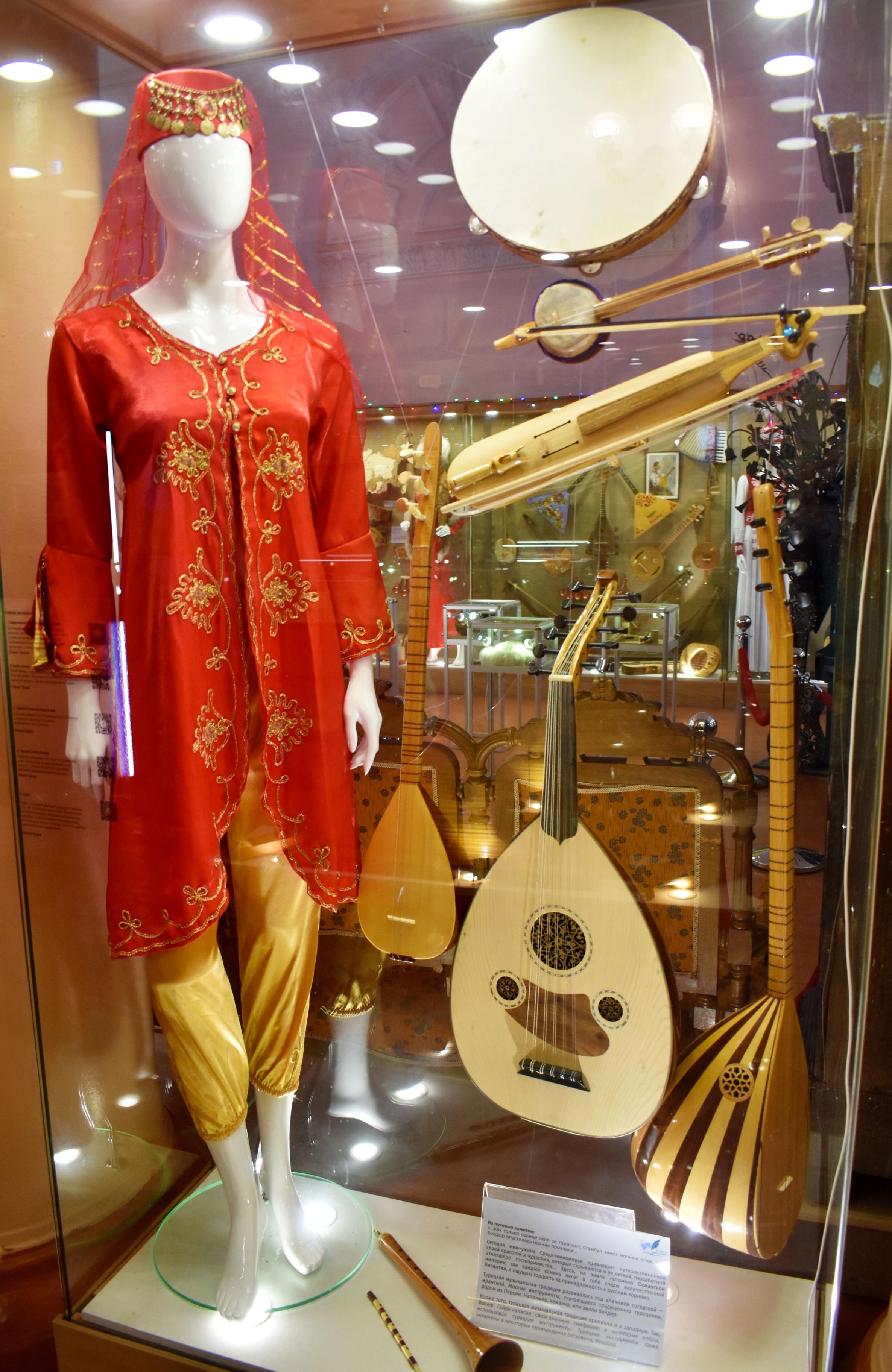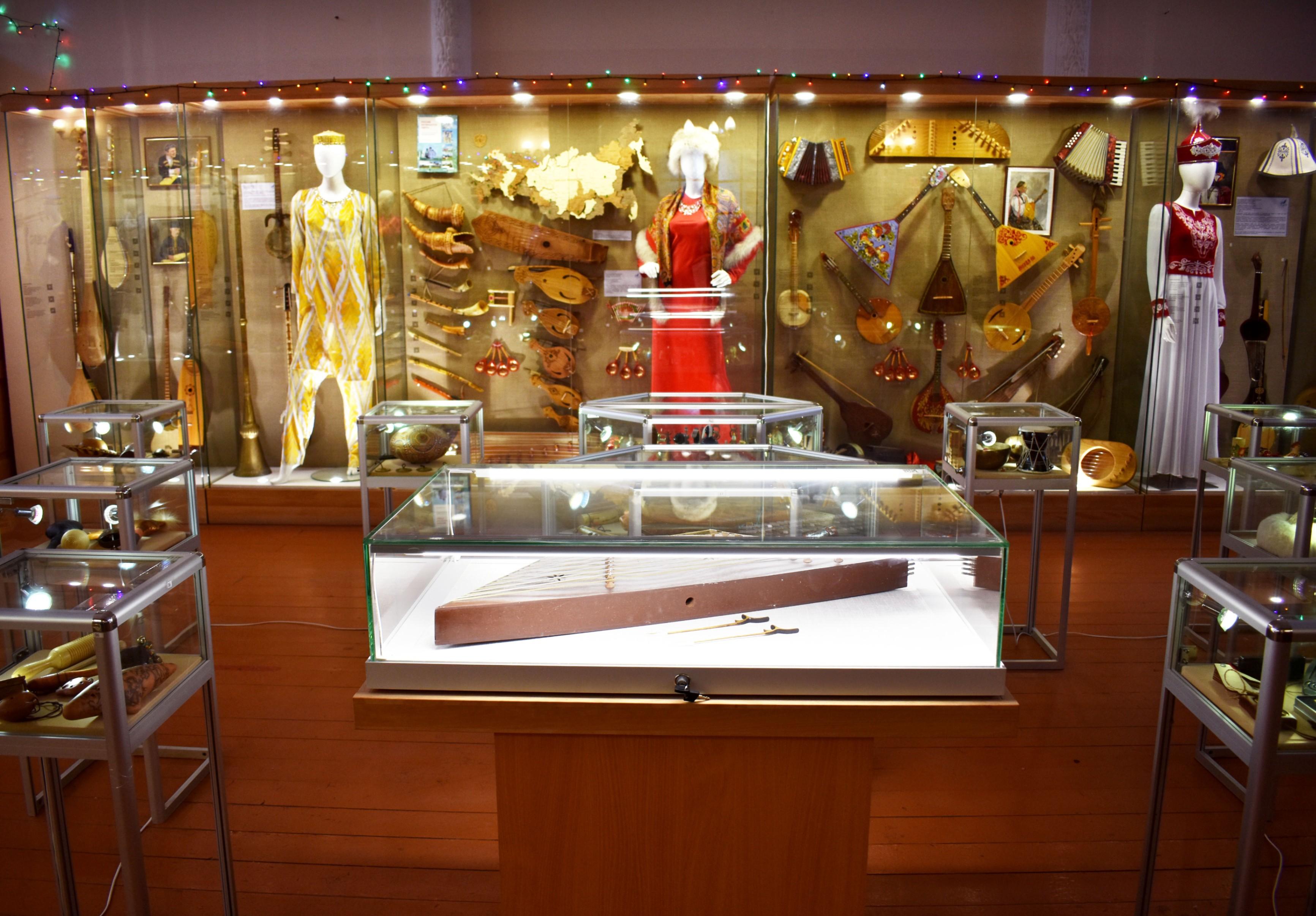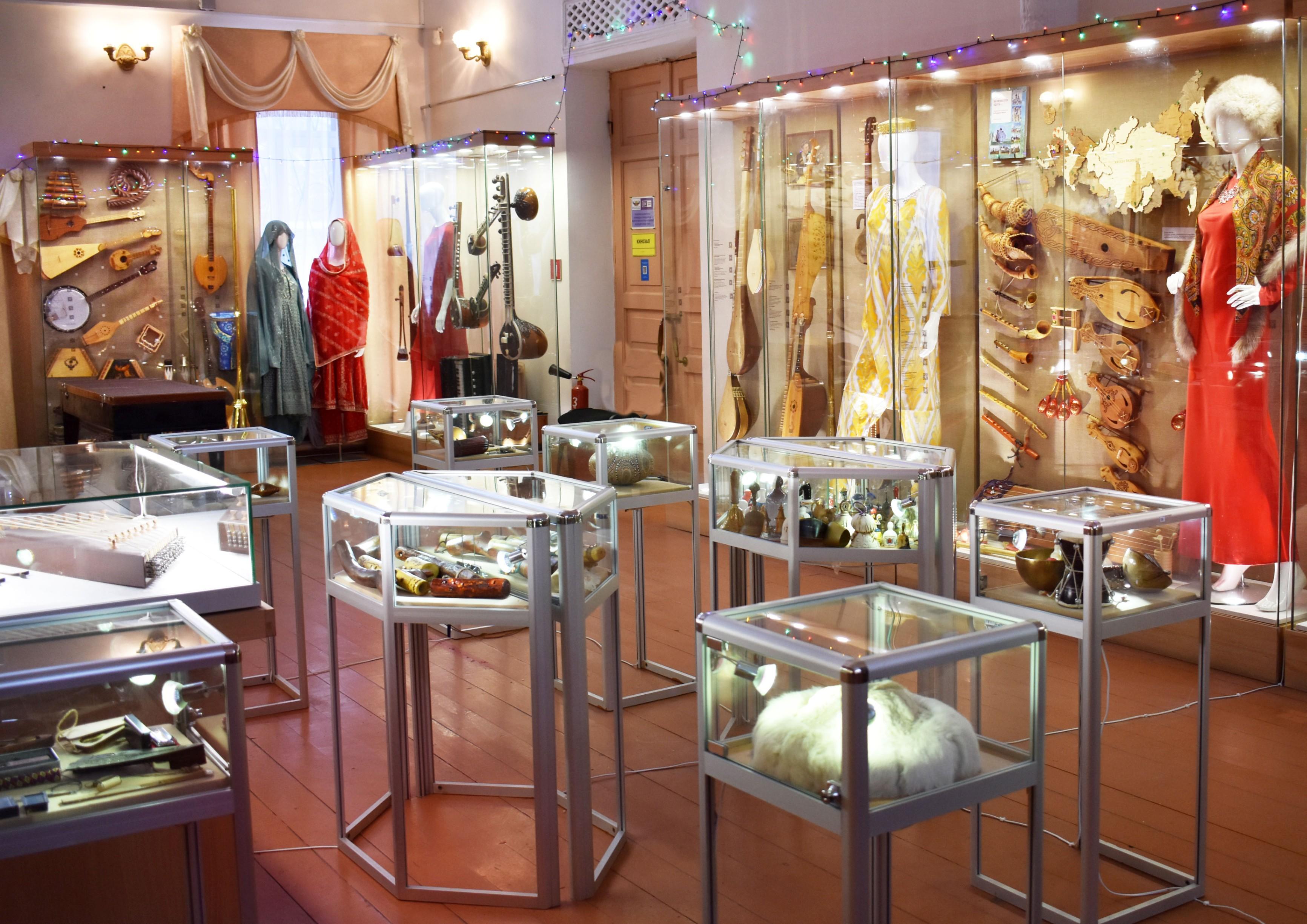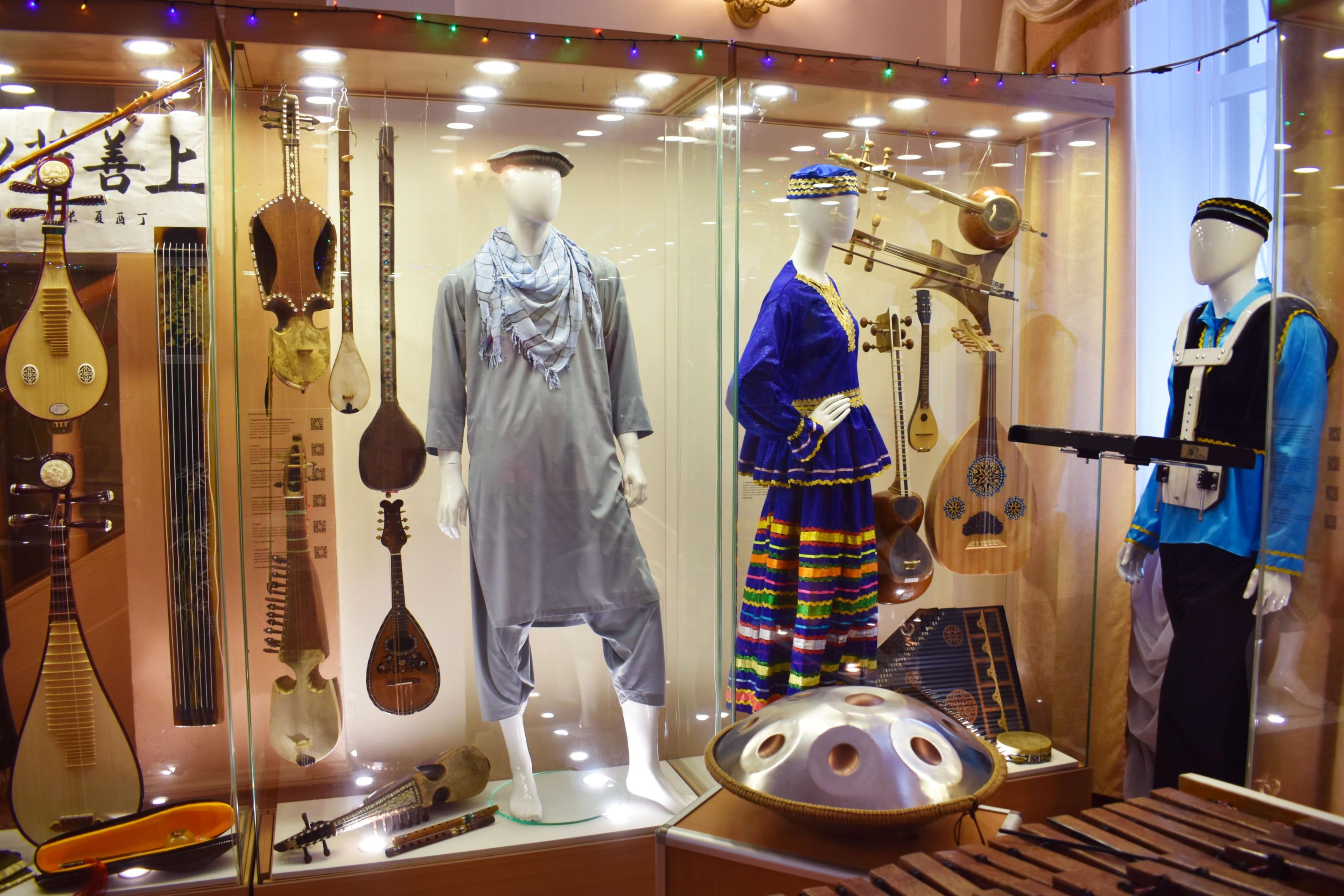 Здесь представлены музыкальные инструменты и одежда народов мира. Это удивительное собрание инструментов станет не только источником вдохновения,но и поможет расширить представление о музыкальном мире различных народов и эпох.В составе новой экспозиции, «Все дороги ведут в РИфМУ», имеется очень много интересных и редких инструментов,например-Карнай. Это народный медный или латунный духовой музыкальный инструмент, распространенный в Таджикистане, Узбекистане, Иране. Является одним из древнейших инструментов. Ему 3000 лет. Эта труба следовала за армиями Тамерлана и Чингисхана на войну.Каждый участник экскурсии сможет узнать о инструментах и о костюмах много интересных фактов,а также почувствовать себя в роли музыканта,взяв в руки любой инструмент.