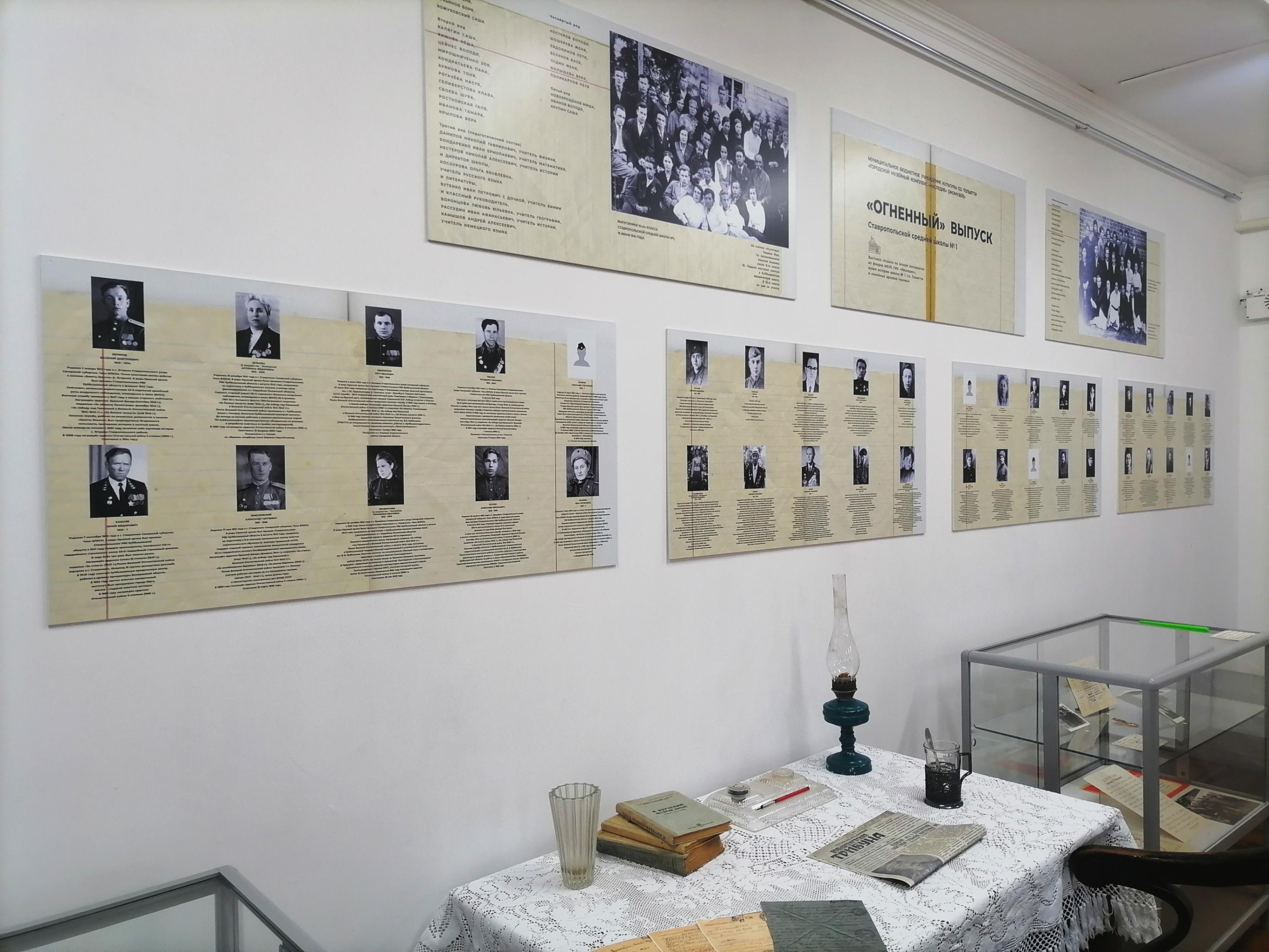 Выставка посвящена выпускникам 1941 года Ставропольской средней школы № 1, большинство из которых уже в первые месяцы Великой Отечественной войны были призваны в ряды Красной армии. К сожалению, многие не вернулись в родной Ставрополь. Жизнь небольшого провинциального Ставрополя (с 1924 года являвшегося селом) Куйбышевской области кардинальным образом изменилась сразу после объявления о начале Великой Отечественной войны. Одними из первых, кто решил добровольно отправиться на фронт, стали именно вчерашние ставропольские школьники, выпускники 10 «А» и «Б» классов местной средней школы № 1. Вечером 21 июня все они собрались на выпускной вечер, чтобы отпраздновать окончание школы. А рано утром 22 июня грянула война… О судьбах каждого из ребят расскажет выставка «Огненный выпуск».