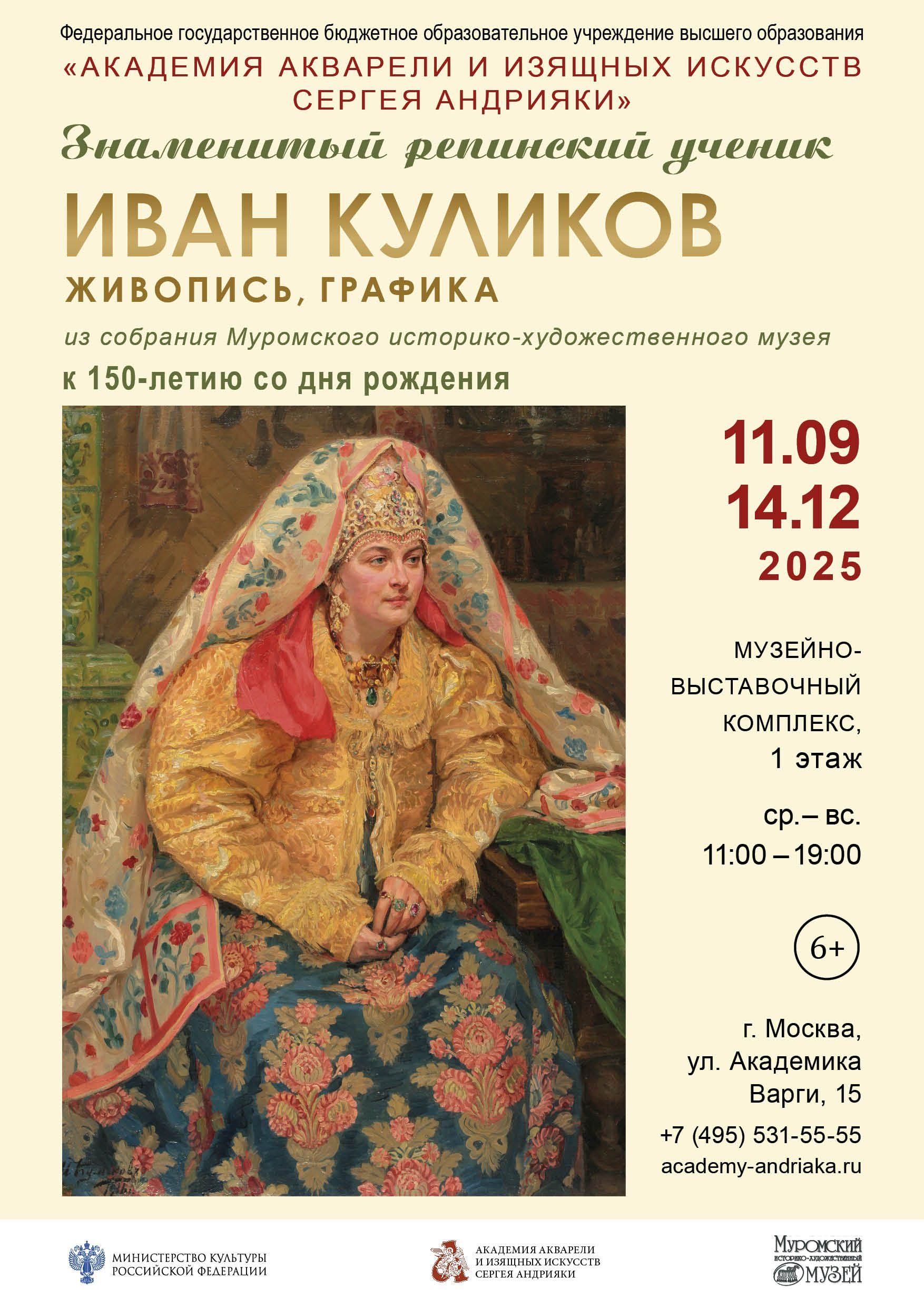 Имя Ивана Куликова едва ли достаточно хорошо известно широкому зрителю: в последнее время лишь отдельные его работы экспонировались на столичных площадках, в частности, в Государственном историческом музее и Музее русского импрессионизма. Между тем, Иван Семенович Куликов – талантливый ученик И.Е. Репина, чье дарование было рано отмечено не только маститым мастером, избравшим его наряду с Б.М. Кустодиевым помощником при написании холста «Торжественное заседание Государственного Совета», но и зарубежной критикой, удостоившей созданный вчерашним выпускником портрет матери Большой серебряной медали в 1905 г. Предлагаемая юбилейная персональная экспозиция – первая на столичной площадке после почти 70-летнего перерыва, призванная восполнить этот очевидный пробел.Оставаясь одним из наиболее последовательных приверженцев репинской живописной манеры, Куликов развивает собственную сюжетную линию, преимущественно посвященную светлой стороне жизни русской провинции: красочным ярмаркам, женским нарядам, свадебной обрядности и т. д., сближающую складывающиеся образы с вселенной, созданной кистью Бориса Кустодиева. Вместес ним уроженец Мурома слагает собирательный образ Руси и ее народа, формирующий в сознании то, что называется национальным культурным кодом.В экспозиции представлены 73 произведения живописи и графики в жанре тематической картины, портрета и пейзажа, относящиеся к различным, преимущественно дореволюционному, периодам творчества художника.