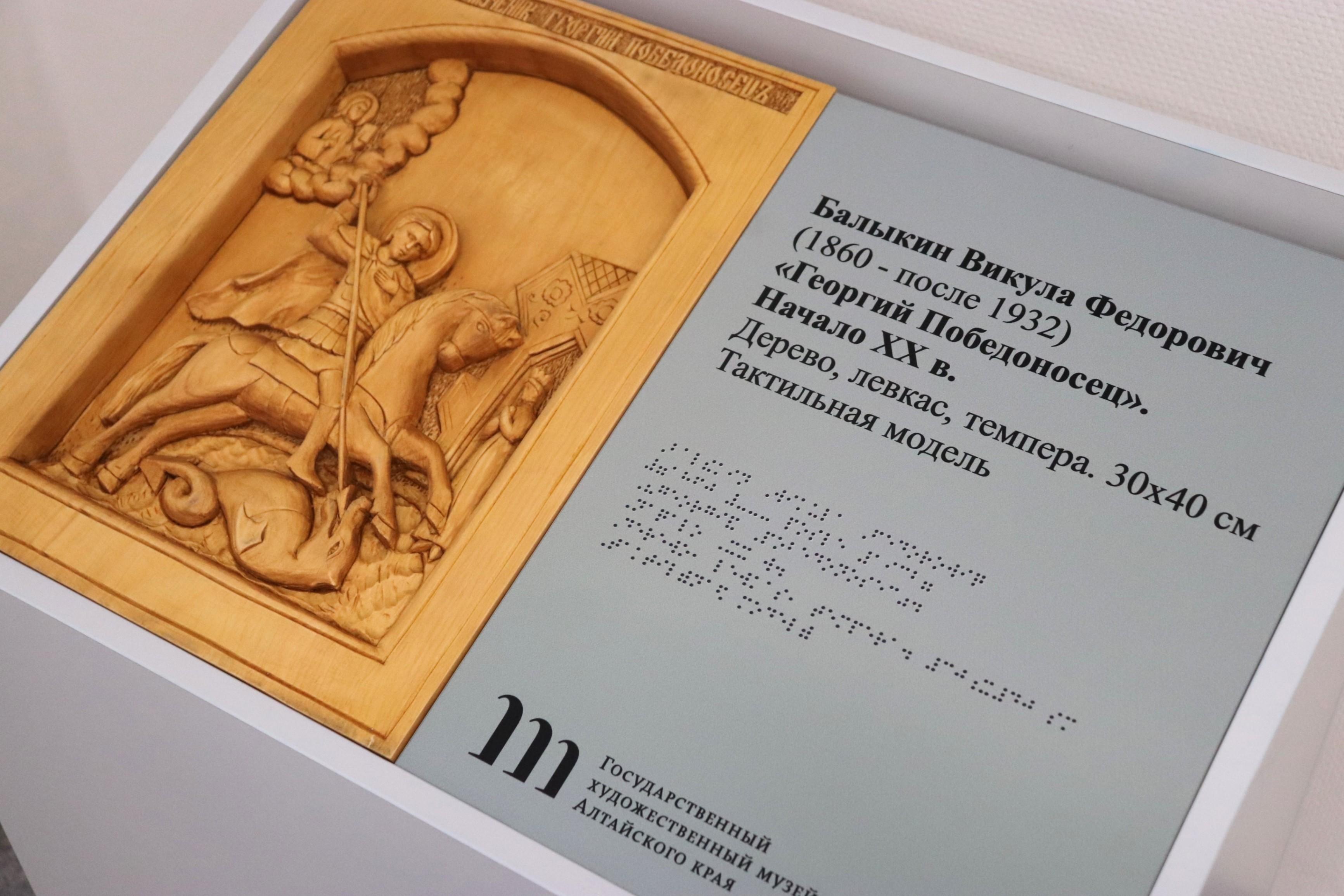 Выставка для незрячих и слабовидящих посетителей. Экспозиция представляет уникальные тактильные копии живописных произведений известных художников XIX –XX вв.: Шишкина И. И. («Лес»), Тропинина В. А. («Дама в зеленом»), Макарова И. К. («Портрет В.Н. Львовой ребенком»), а также тактильные модели икон Балыкина В. Ф. конца XIX – начала XX в., выполненные в технике резьбы по дереву из кедра алтайским мастером-краснодеревщиком Александром Грановым. Инклюзивная практика поможет посетителям понять, что представляет собой конкретное произведение искусства. Тактильные копии играют роль проводника в мир изобразительного искусства и помогают незрячим посетителям получать информацию об экспонатах.