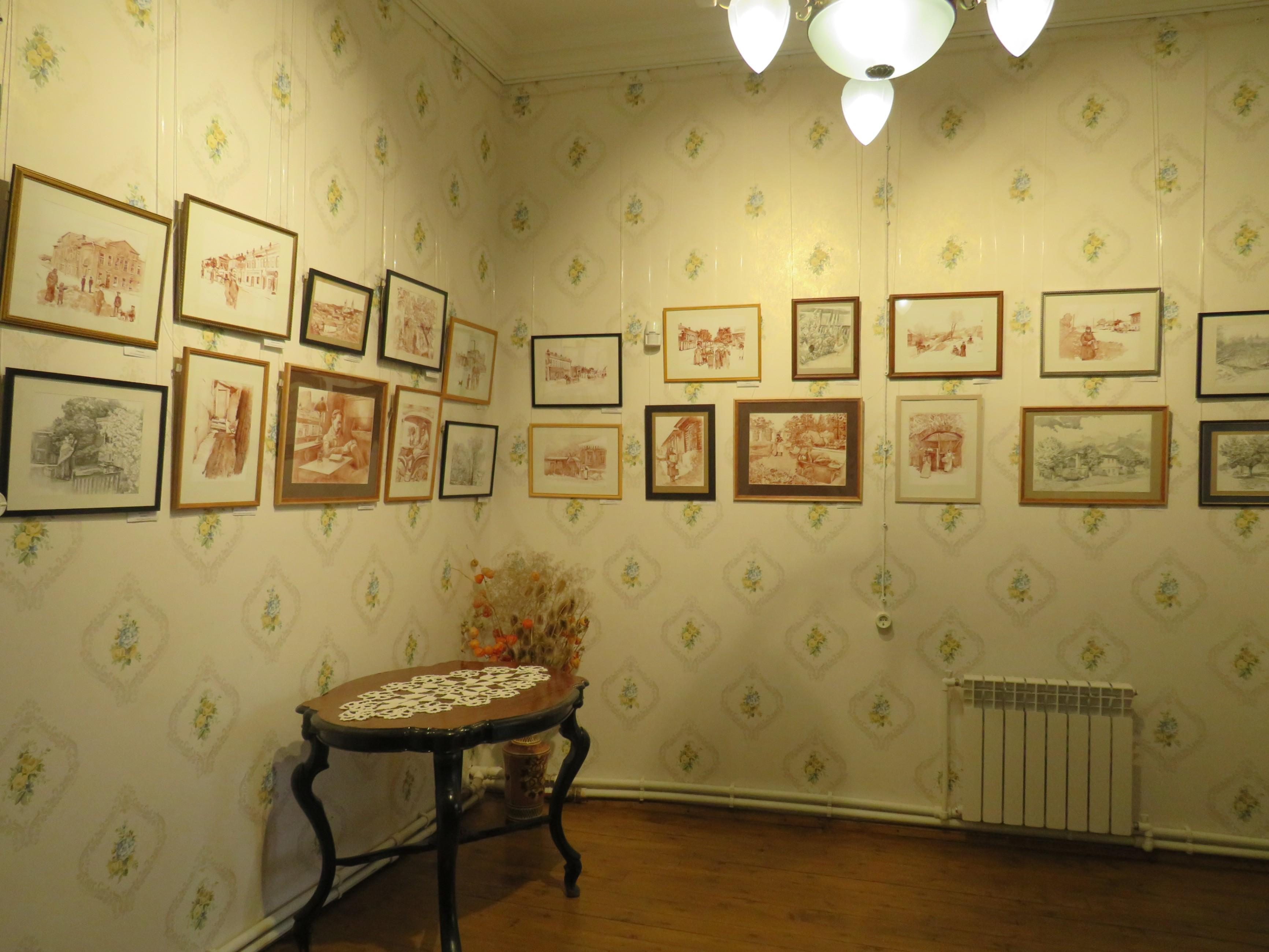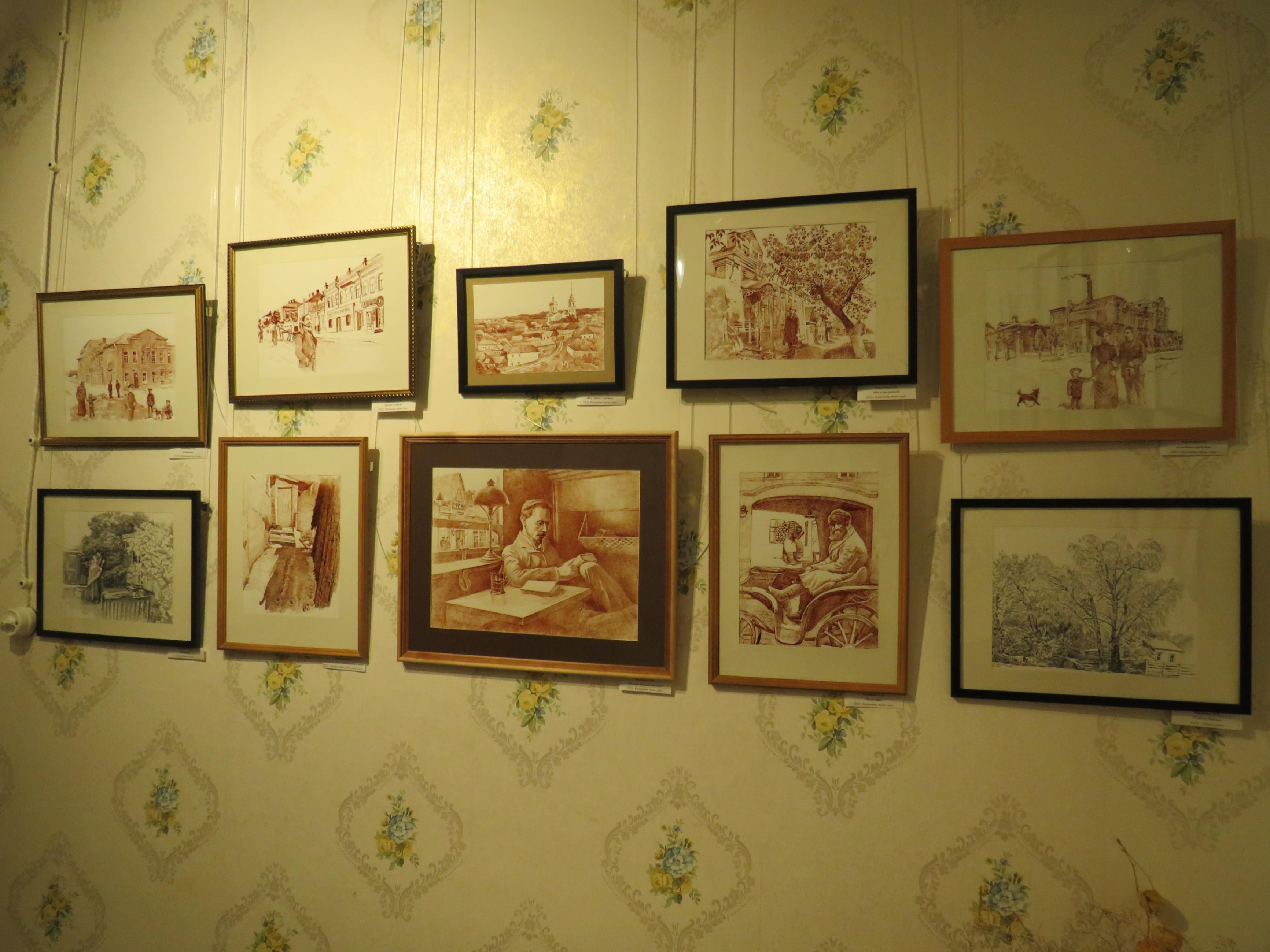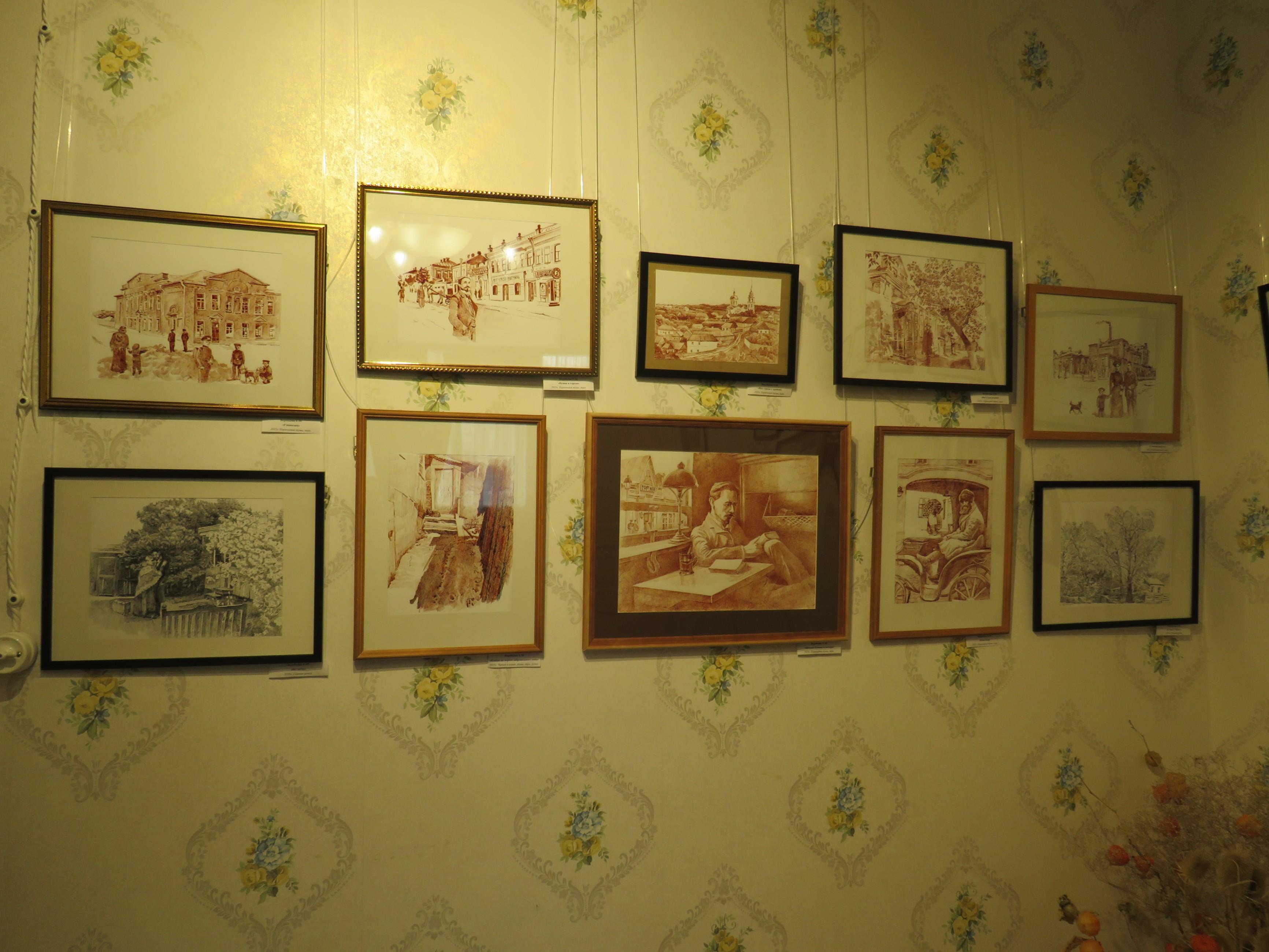 Выставка Воробьевой Елены Михайловны, преподавателя «Ефремовской детской художественной школы». Является преподавателем высшей категории. Преподает рисунок, композицию, предмет по выбору (графика). Любимый вид изобразительного искусства – графика.Выставка посвящена городу Ефремов и 155-летней годовщине со дня рождения Ивана Алексеевича Бунина. Работы выполнены с применением коричневой туши. На выбор материала художником с одной стороны повлияло то, что техника напоминает старинную фотографию, а с другой – произведение Ивана Алексеевича Бунина «Чаша жизни», в котором прототипом города Стрелецка стал город Ефремов. Световые и цветовые характеристики – отличительная черта творчества И.А. Бунина. От пейзажа в работах художник перешел к применению стаффажа в своих работах, а от стаффажа к сюжетным работам на темы из жизни Ивана Алексеевича и его семьи. В состав экспозиции входят 23 картины.