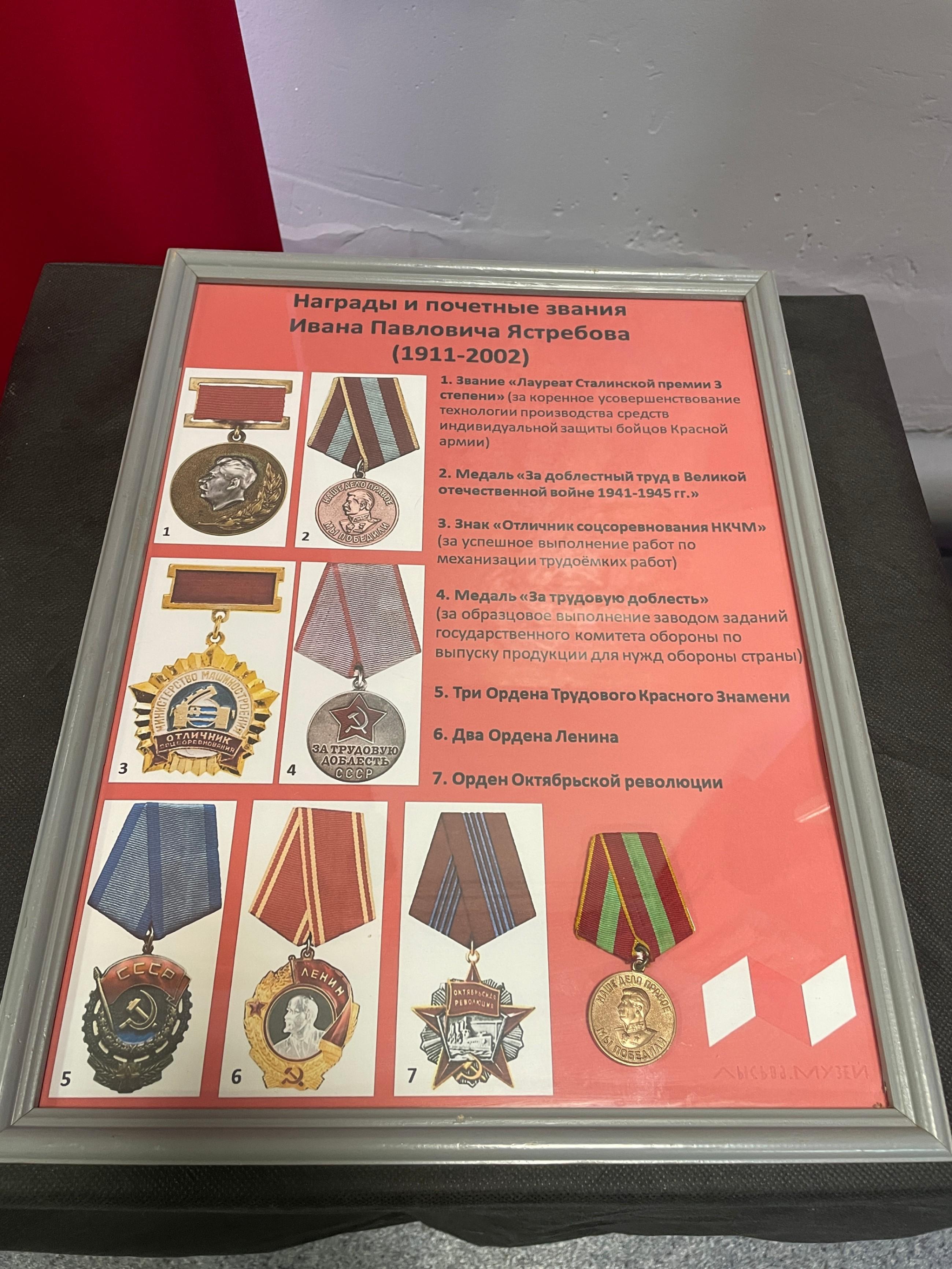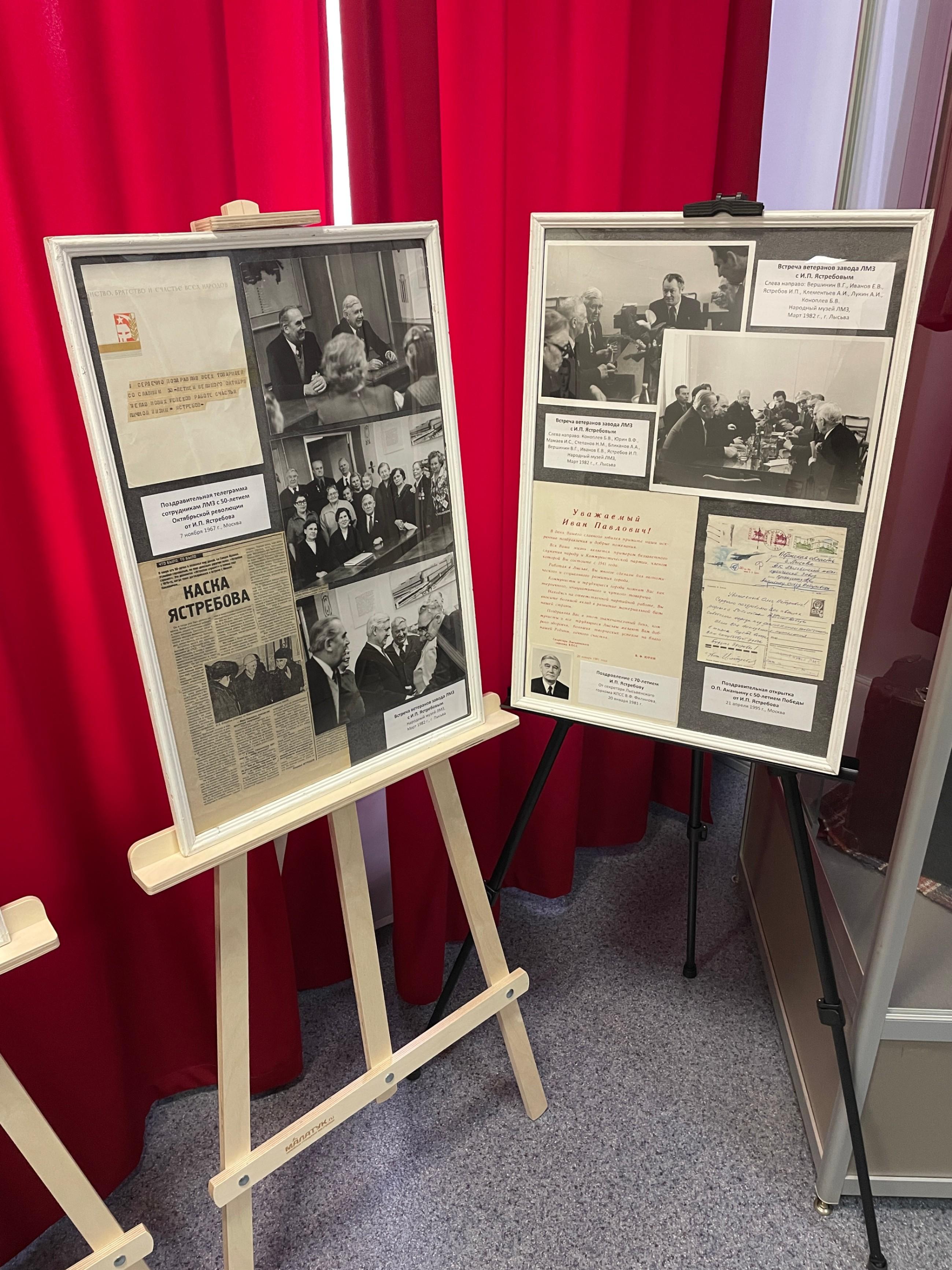 Экспозиция посвящена 115-летию руководителя технического отдела ЛМЗ в годы Великой Отечественной Войны, Лауреату Сталинской Премии Ивану Павловичу Ястребову. Посетители смогут узнать, что под руководством И. П. Ястребова в годы войны была разработана легендарная лысьвенская каска СШ-40. «Условия перед специалистами стояли непростая: довоенные образцы касок пули прошивали с легкостью, а увеличивать вес солдатского шлема было нельзя, 800 граммов – и баста!» – писал Иван Павлович. За разработку средств индивидуальной защиты бойцов и командиров Красной армии И. П. Ястребов был удостоен Сталинской Премии 3-ей степени. Свою премию Иван Павлович перечислил в Фонд обороны. Главной же своей наградой считал благодарственные письма с фронта: «Спасибо, уральцы, за каску! Она спасла мне жизнь…»Организованные группы записываются на посещение экспозиции по телефону: +7 (34249) 30065.