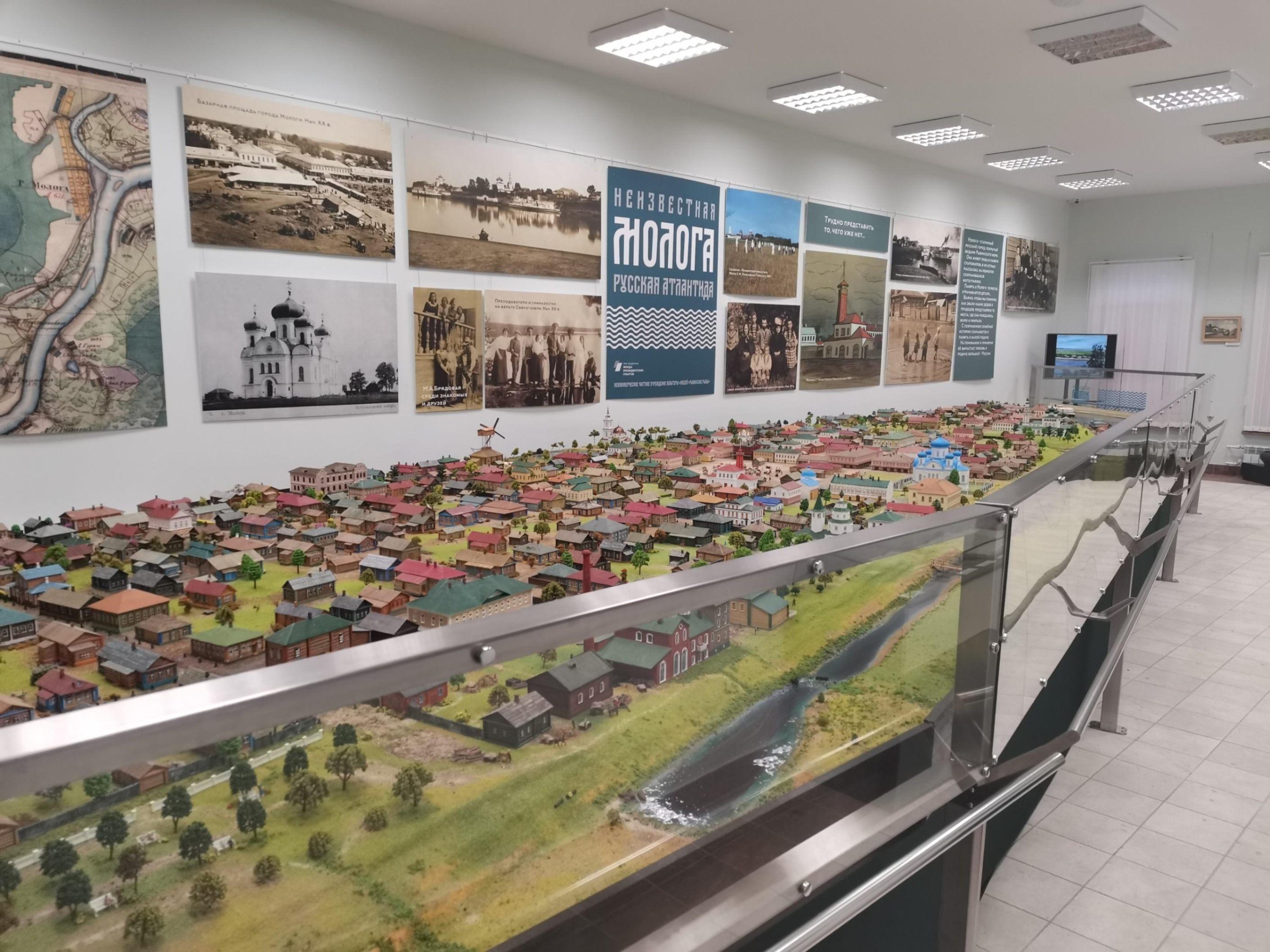 Выставка является итогом сотрудничества музея «Рыбинские рыбы» и Рыбинского музея-заповедника в рамках проекта, поддержанного в 2019 году Фондом президентских грантов. Молога – старинный русский город, ныне скрытый водами Рыбинского водохранилища. Главная идея выставки заключается в том, чтобы постараться оживить бывший город через создание его архитектурно-исторического макета, который бы позволил наглядно представить Мологу, какой она была в начале XX века, за 30 лет до уничтожения и затопления Рыбинским рукотворным морем. Центральный экспонат выставки – макет города Мологи – разрабатывался большой группой специалистов: историками, архитекторами, инженерами, программистами, художниками, дизайнерами. Все объекты макета (около 400) созданы в масштабе 1:100 по архивным фотографиям, планам и чертежам, а также по личным воспоминаниям мологжан. Именно на этой документальной основе архитектор начертил двухмерные планы зданий, после чего программист создал их 3D-модели. Затем все объекты макета были напечатаны из белого пластика на 3D-принтере и раскрашены вручную. Здесь можно увидеть все главные городские храмы и общественные учреждения. На макете реализовано несколько интерактивных сценариев. Можно услышать воспоминания старых мологжан-переселенцев, а также посмотреть документальный анимационный фильм.