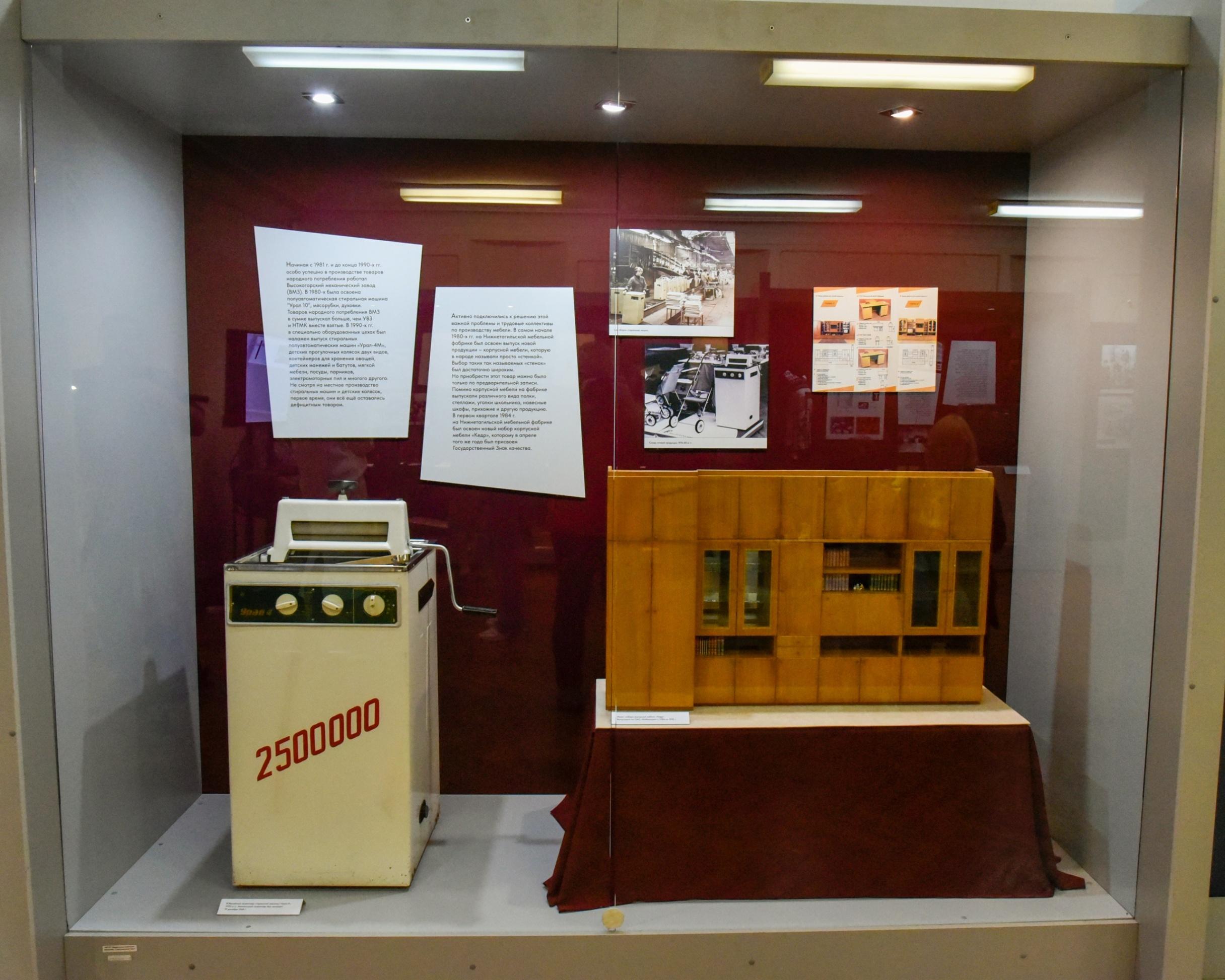 Выставка посвящена последним десятилетиям советской эпохи. Экспозиция переносит в то время, когда дефицитные товары приходилось доставать с трудом – стоять в длинных очередях или переплачивать на рынках, известных в народе как «барахолки». Дефицит охватывал практически всю продукцию: одежду, парфюмерию, аксессуары, мебель, велосипеды, бытовую технику и многое другое. Но в 1986 году, когда Городской Совет Нижнего Тагила утвердил комплексную программу выпуска товаров народного потребления, ситуация начала меняться в лучшую сторону. На большинстве предприятий Нижнего Тагила были организованы условия для производства продукции, в которой так остро нуждалось население города. На выставке представлено более 200 экспонатов, изготовленных в 1970–1990-х годах на нижнетагильских заводах и фабриках. Среди них – детские игрушки, коляски, швейные и трикотажные изделия, посуда, обувь и бытовые приборы советской эпохи.Подробная информация – по телефону: +7 (9090) 17-16-63.