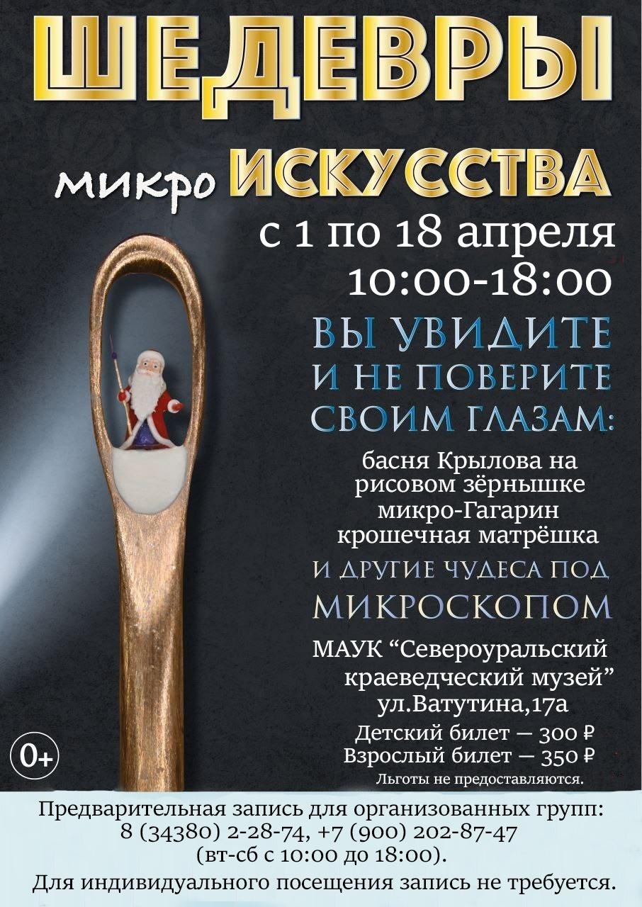 Зрителей ждет встреча с поразительным творчеством доктора физико-математических наук Владимира Михайловича Анискина, мастера, чье искусство в современной России не имеет аналогов. Владимир Михайлович создает микроминиатюры, которые раскрывают свою красоту лишь при детальном, зачастую микроскопическом, рассмотрении. Экспозиция включает 43 работы, созданные с применением последних научных достижений и затрагивающие важнейшие темы российской культуры и истории – от значимых вех в освоении космоса и проявлений воинской доблести до почитаемых православных святынь и образов из читательских воспоминаний детства. Ранее выставка с успехом прошла в Беларуси, Китае, странах Балтии и Восточной Европы, а теперь посетители Североуральского краеведческого музея смогут лично оценить эти уникальные произведения.
