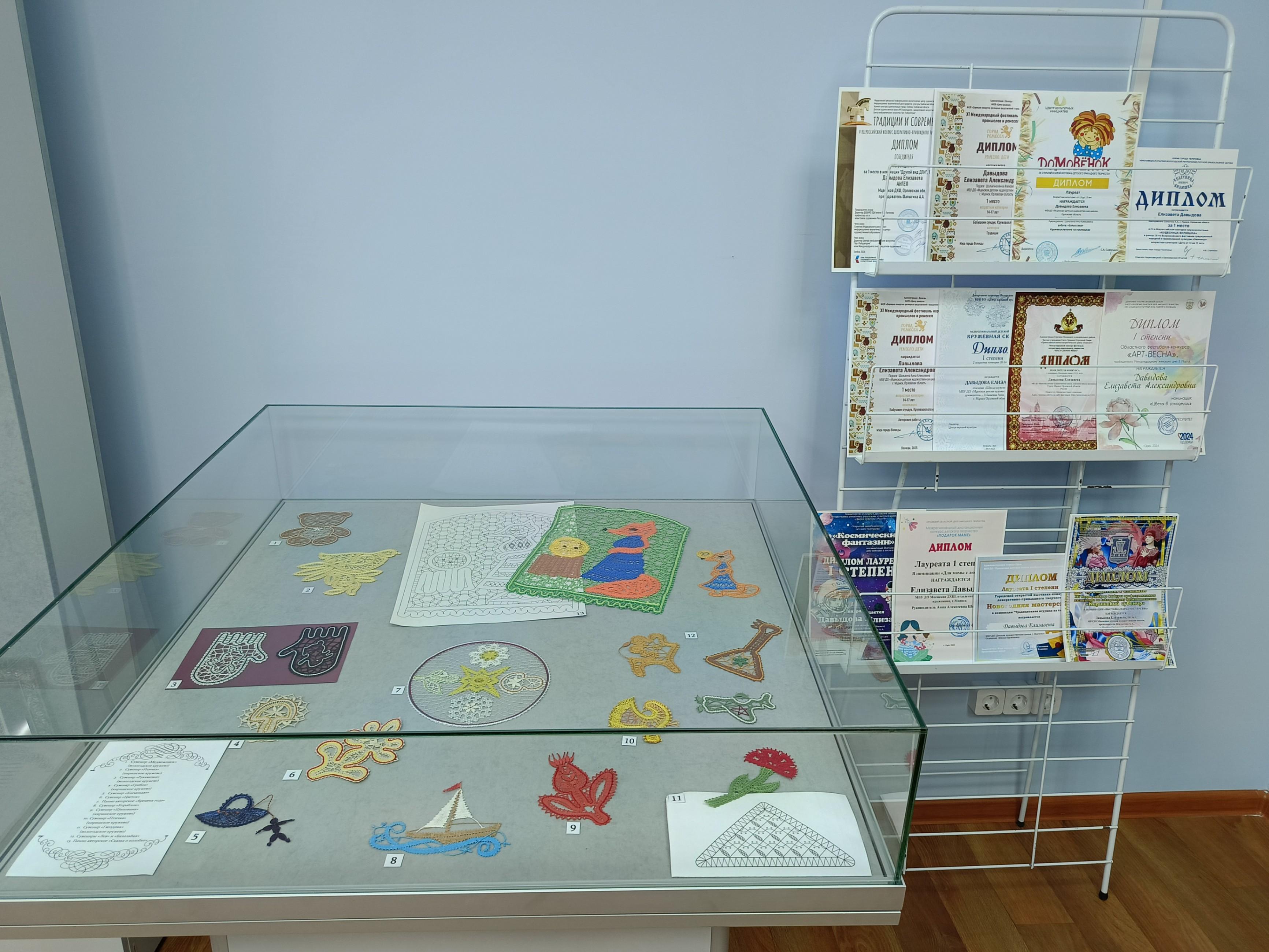 Мценское кружево... Один из самых старинных видов коклюшечного кружевного производства известный с конца XVIII века. Красота, сотворенная руками мценских мастериц, украшала наряды не только местных, но и столичных модниц. Но все меняется в нашей жизни... На смену ручному труду пришли машины, мода диктовала свои правила. И как же отрадно сознавать, что спустя два столетия мценское кружево живет! Есть мастерицы, готовые продолжать чудесное дело кружевоплетения. Выставка знакомит посетителей с творчеством юной кружевницы Елизаветы Давыдовой, воспитанницы Детской художественной школы г. Мценска (педагог народный мастер России Анна Шалыгина), стипендиата Губернатора Орловской области, победителя и лауреата многих международных и общероссийских конкурсов. По итогам XI Международного фестиваля народных промыслов и ремесел «Город ремесел» в Вологде (2025 г.) Елизавета признана лучшей юной кружевницей России. Елизавета занимается кружевом с 2019 года, активно популяризирует этот вид традиционного рукоделия среди молодежи, своим примером доказывая, что коклюшки с нитями не прошлый век, а путь к красоте и гармонии. Посетителей выставки ждет погружение в чудесный и загадочный мир мценского кружева, знакомство с технологией его изготовления, возможностями использования изделий в современной жизни. На выставке представлены изделия, участвовавшие в конкурсах и выставках.
