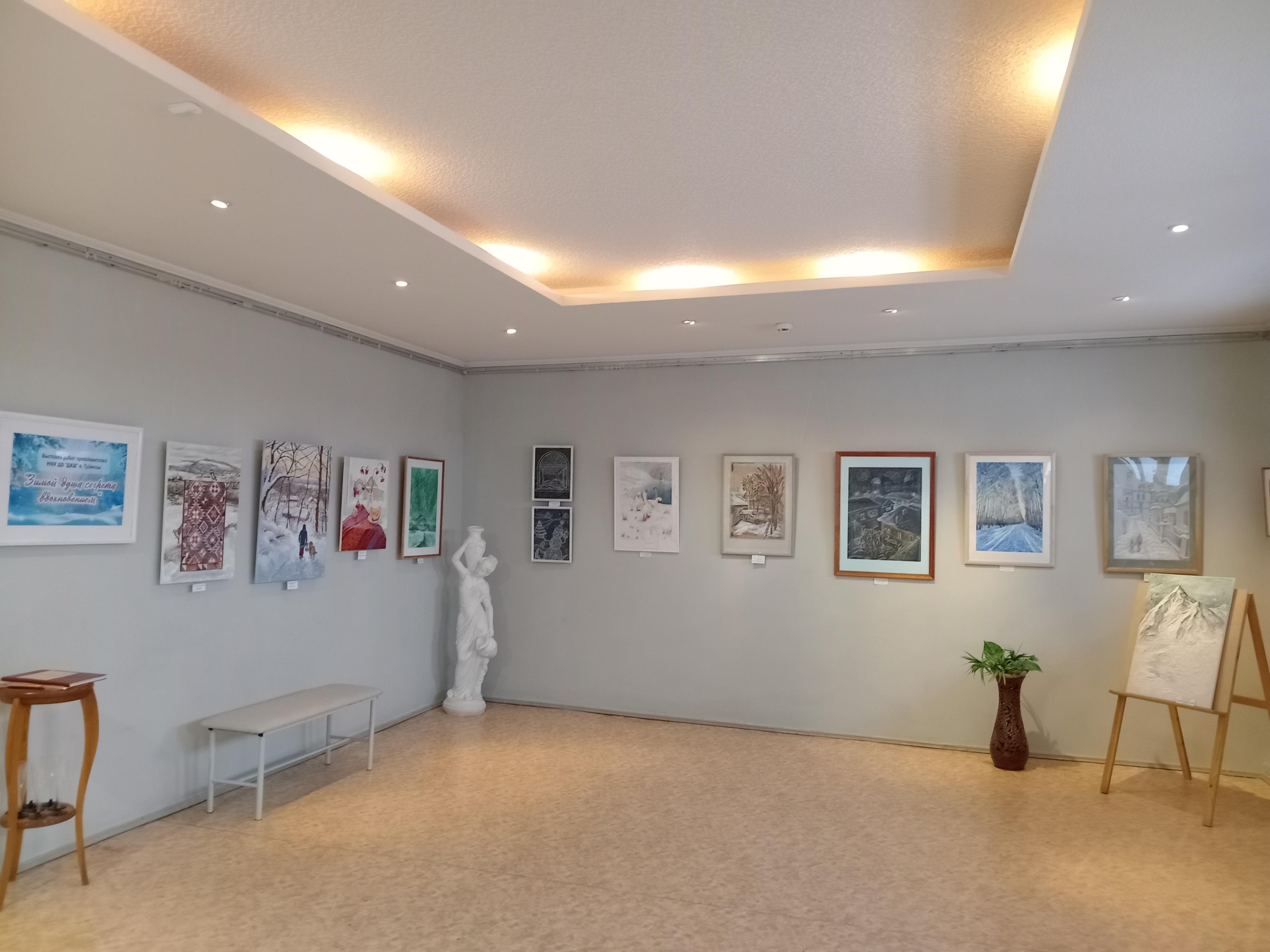 Детская художественная школа города Туймазы приглашает на выставку творческих работ преподавателей, посвященную одной из самых поэтических и вдохновляющих времен года – зиме . Выставка расположена в выставочном зале школы, где представлены работы, выполненные в разных материалах: акварель, пастель, масляные краски, акрил, гуашь, батик, маркер, шерсть, шпатлевка.Каждый автор по-своему раскрывает тему зимы: заснеженные пейзажи, тихие деревенские улочки, город в морозном свете фонарей, зимние состояния души, портреты. Выставочный зал встречает множеством живописных полотен и знакомит с образным языком различных видов художественного творчества. Выставка поражает своим разнообразием. Каждое произведение искусства является глубоко индивидуальным и уникальным.